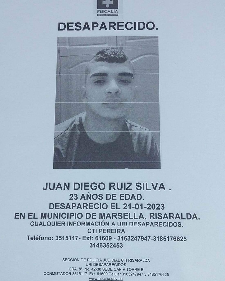 Tras una larga investigación, las entidades dedicadas al proceso habrían descubierto en una zona boscosa a 10 minutos del casco urbano del municipio el cuerpo que inicialmente se pensaba era  de Juan Diego Ruiz Silva, más conocido como “Pancho”, este es un joven de 23 años, que desapareció desde el 21 de enero del presente año, y del cual sus padres no saben nada.
