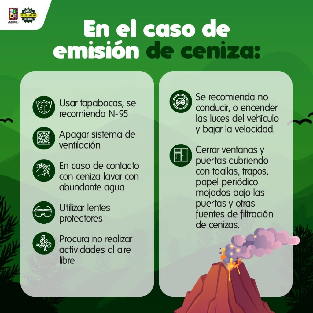 La Unidad Nacional para la Gestión del Riesgo de Desastres (UNGRD) ha activado los Comités de Gestión del Riesgo y ha emitido un comunicado oficial anunciando un cambio en el nivel de actividad. Se han incluido una serie de recomendaciones, entre ellas, el uso de tapabocas, apagar los sistemas de ventilación y utilizar lentes protectores, especialmente para personas con problemas respiratorios.
