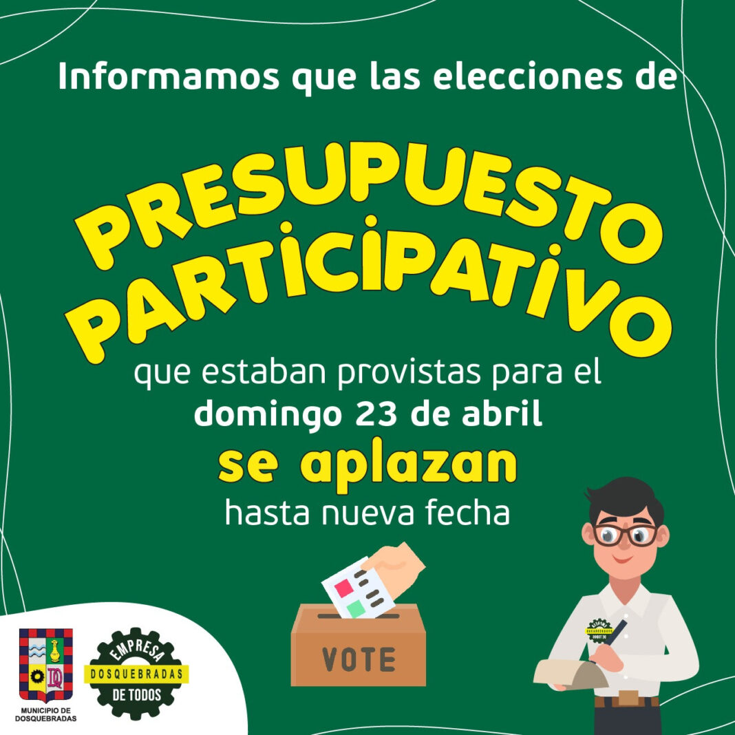 La Administración Municipal ‘Empresa de Todos’ atendiendo queja instaurada por un ciudadano habitante de la Comuna 10, ante la Personería Municipal de Dosquebradas, por posibles irregularidades en la etapa de preinscripción por parte de los votantes al presupuesto participativo en el Municipio de Dosquebradas, se definió que se aplaza el proceso que estaba previsto para el domingo 23 de abril.