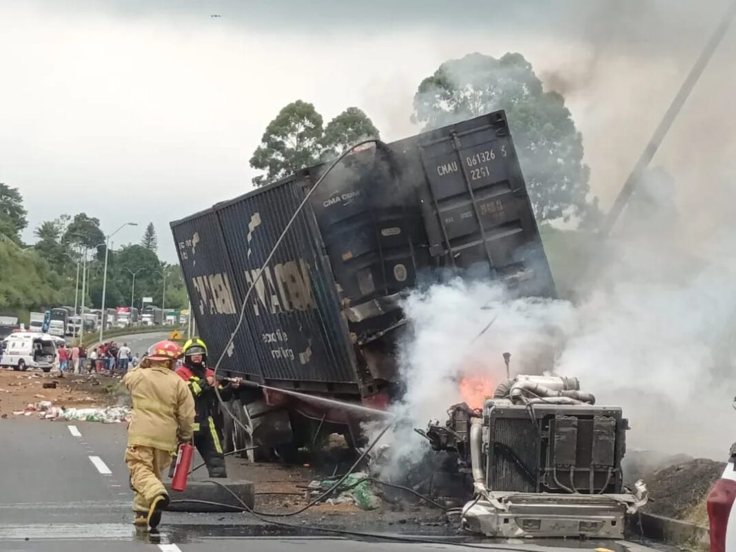 Héber Andrés Marín, conductor del tractocamión placa SWK-619, resultó herido después de que la cabina de su vehículo se incendiara tras un choque múltiple en la autopista del Café, a la altura de la intersección 1.5 del municipio de Circasia. Según el informe de la Secretaría de Tránsito y Transporte, Setra, de la Policía del Quindío, el conductor está siendo atendido en el hospital San Juan de Dios de Armenia.