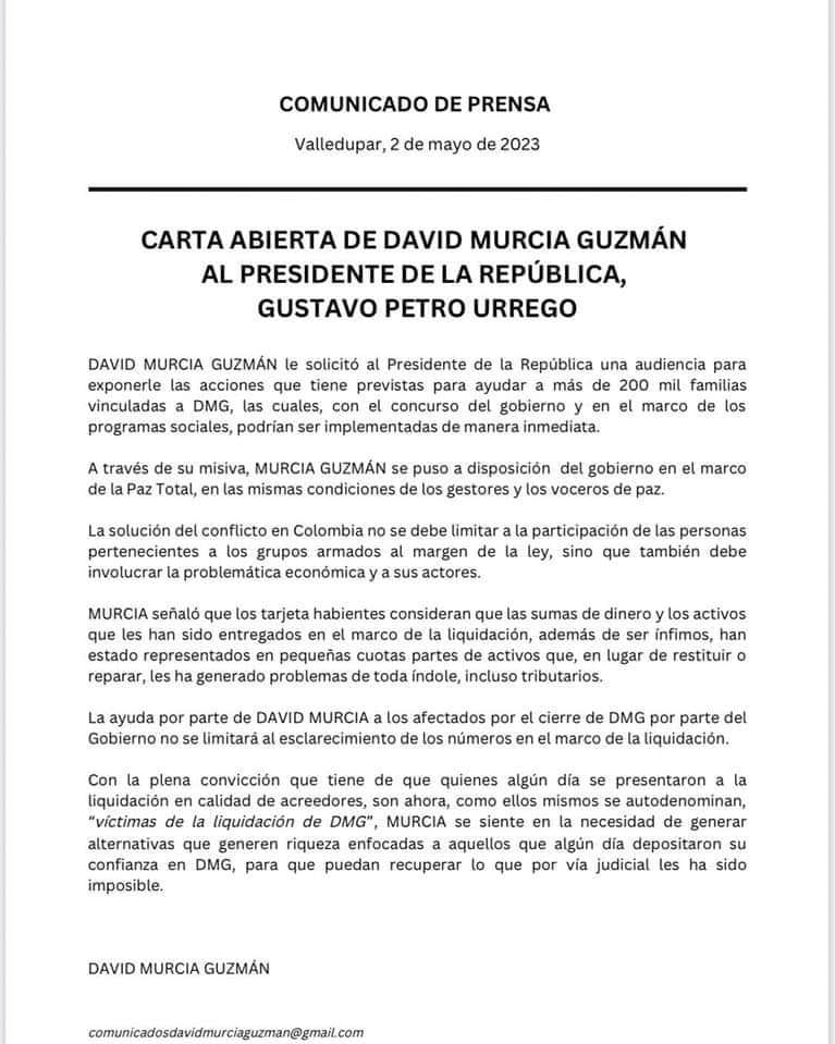 Además, Murcia menciona algunos nombres importantes que estaría dispuesto a dar para esclarecer lo ocurrido con la pirámide que dejó a muchas personas en la ruina. Según la misiva, la ayuda de Murcia a los afectados por el cierre de DMG no se limitará al esclarecimiento de los números en el marco de la liquidación.