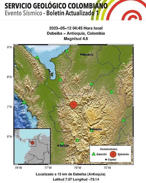 Dabeiba, Antioquia, Colombia – En la madrugada del 12 de mayo de 2023, a las 04:45 hora local, se registró un evento sísmico en la región de Dabeiba, ubicada en el departamento de Antioquia, Colombia. Según el Boletín Actualizado 1 emitido por las autoridades sismológicas, el sismo tuvo una magnitud de 4.6 en la escala de Richter y una profundidad de 40 kilómetros.