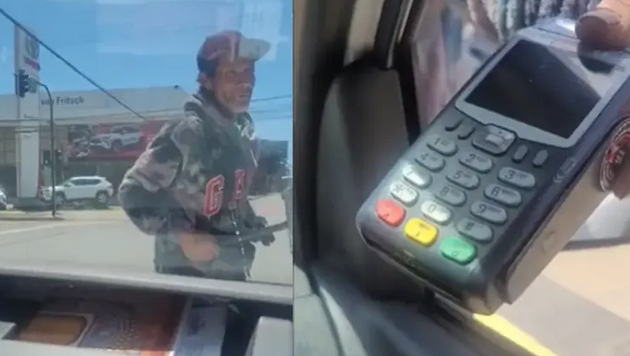 Limpiavidrios utiliza datáfono en los semáforos para pedir dinero.