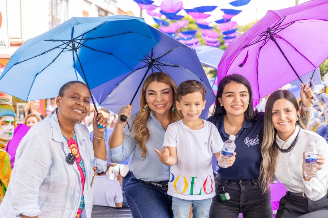 Durante la ceremonia, la Calle del Encuentro se transformó en un vibrante espacio lleno de sombrillas azules y moradas, símbolos de compromiso y esperanza. María Irma se compromete a hacer de Pereira una ciudad segura donde los niños alcancen sus sueños en un entorno de amor y respeto.