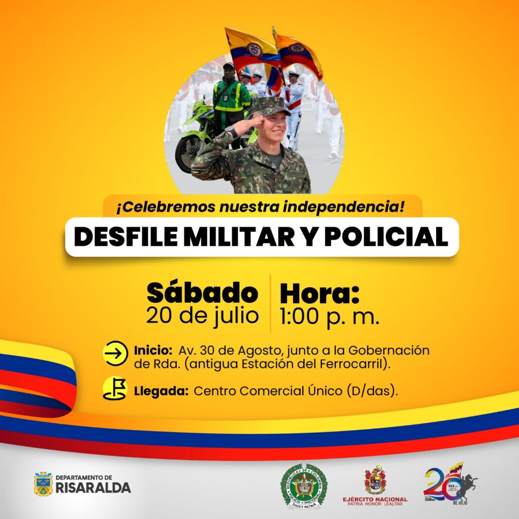 Este sábado 20 de julio, Risaralda se prepara para celebrar con orgullo los 214 años del grito de Independencia de Colombia con un imponente Desfile Militar y Policial. El gobernador Juan Diego Patiño Ochoa encabezará el evento junto a cerca de 2.000 uniformados de las Fuerzas Militares y la Policía Nacional, quienes desfilarán por las principales calles de Pereira y Dosquebradas.