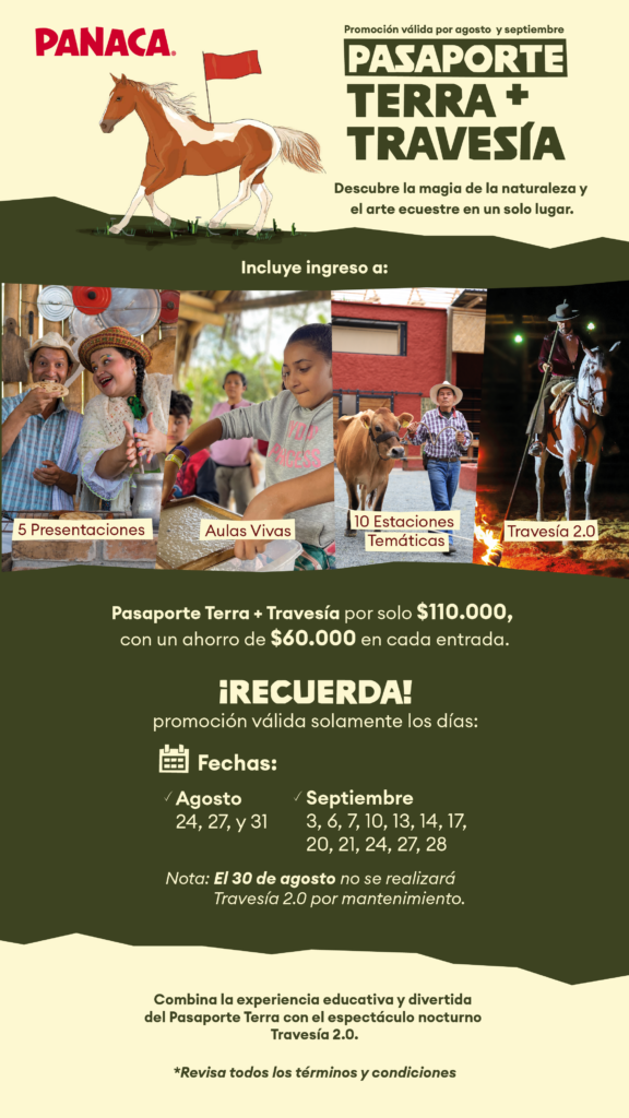 Durante agosto y septiembre de 2024, PANACA te invita a sumergirte en una experiencia única con la compra del Pasaporte Terra. Este pase especial te permite explorar el parque durante todo el día, desde las 9:00 a.m., y culminar tu visita con el impresionante espectáculo Travesía 2.0. Habitualmente, el costo combinado de ambas experiencias es de $170.000 pesos, pero gracias a esta oferta exclusiva, podrás disfrutar de una jornada completa por solo $110.000 pesos. Esta oferta estará disponible para fechas seleccionadas, así que ¡no te la pierdas!