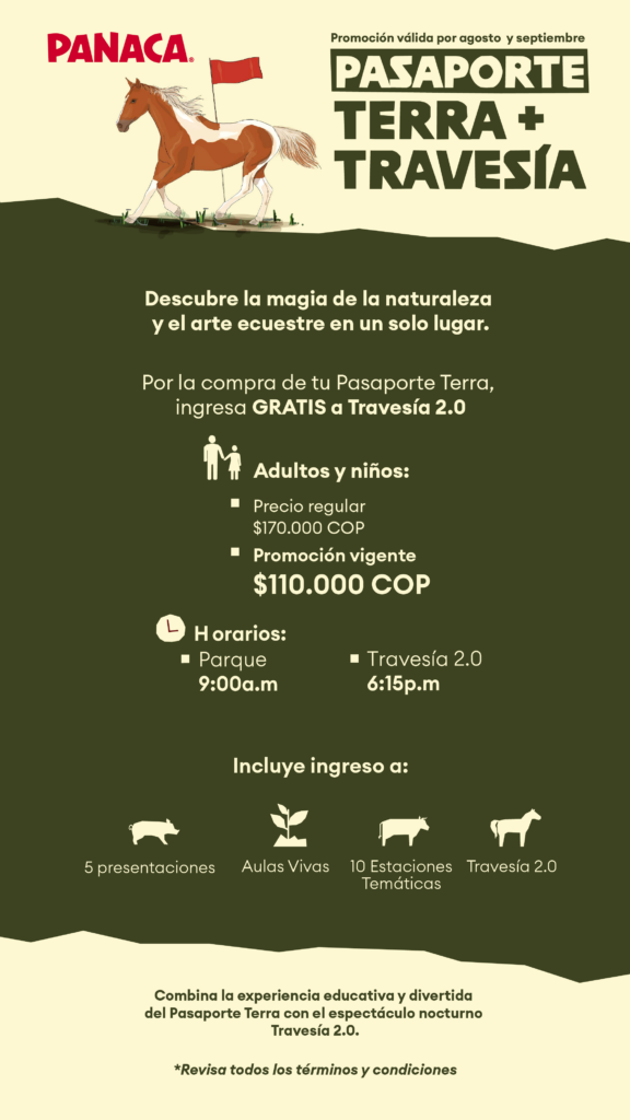 Para más información sobre la promoción o cualquier consulta adicional, puedes comunicarte al número +57 310 6818818 o seguirnos en nuestras redes sociales. ¡No pierdas la oportunidad de vivir un día completo de conexión con el campo y entretenimiento en PANACA! Compra tu Pasaporte Terra en nuestra página web y prepárate para una experiencia inolvidable. ¡Te esperamos en PANACA!