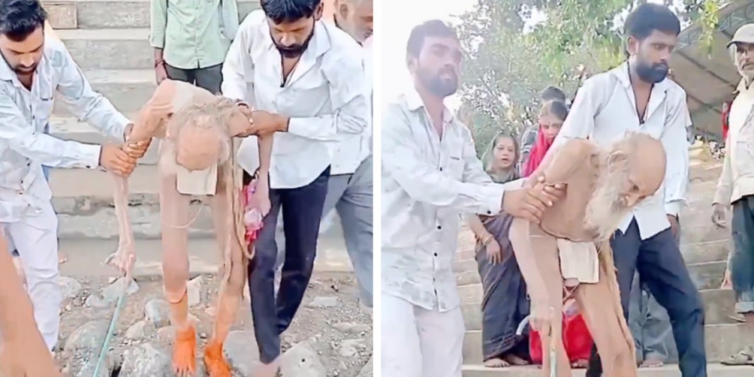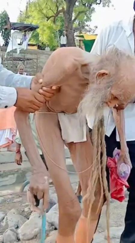 En un sorprendente giro de los acontecimientos, un video que muestra a un hombre supuestamente rescatado de una cueva en India ha capturado la atención de las redes sociales. Según los informes de medios locales, el hombre, que afirmó tener 188 años, fue encontrado en un estado alarmante de salud y ha suscitado un intenso debate sobre la veracidad de su historia. El video, que se ha vuelto viral, muestra al anciano, visiblemente delgado y jorobado, caminando con la ayuda de un bastón mientras es sostenido por dos personas.
