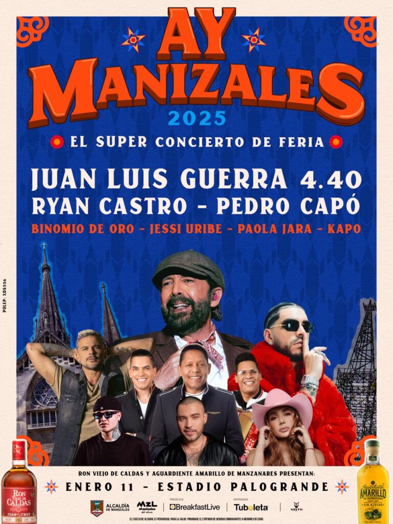 Este 2025, el Super Concierto Ay Manizales promete ser uno de los eventos musicales más espectaculares de la feria. Artistas de la talla de Juan Luis Guerra, Ryan Castro, Pedro Capó, Paola Jara, Binomio de Oro, Jessi Uribe y Kapo subirán al escenario para ofrecer una noche llena de ritmo, música y emoción.