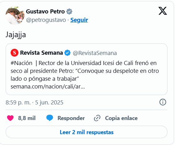 La respuesta del presidente no tardó. Utilizando su cuenta personal en X (antes Twitter), Petro reaccionó con una simple carcajada. Esta breve pero significativa reacción fue interpretada por muchos como una burla hacia el rector y hacia quienes comparten su preocupación.