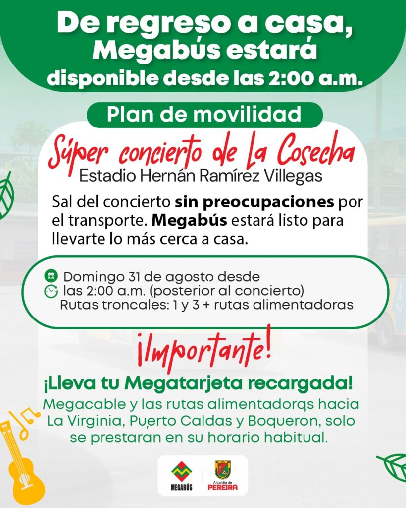 Megabús anuncia horario extendido desde las 2:00 a.m. por el súper concierto de las Fiestas de la Cosecha en Pereira, garantizando transporte y movilidad segura.
