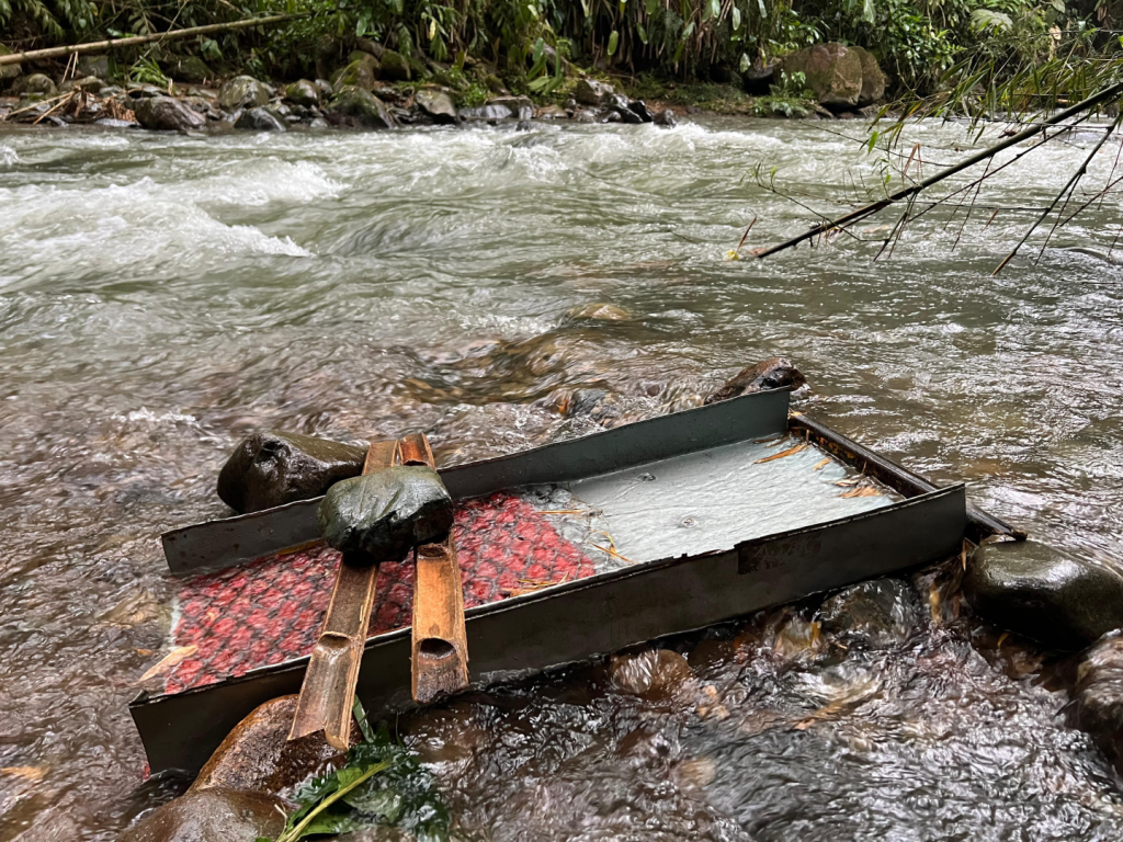 Las autoridades también hallaron infraestructura artesanal utilizada en la explotación. Entre los elementos encontrados había bateas y tanques empleados para el lavado del material aurífero.