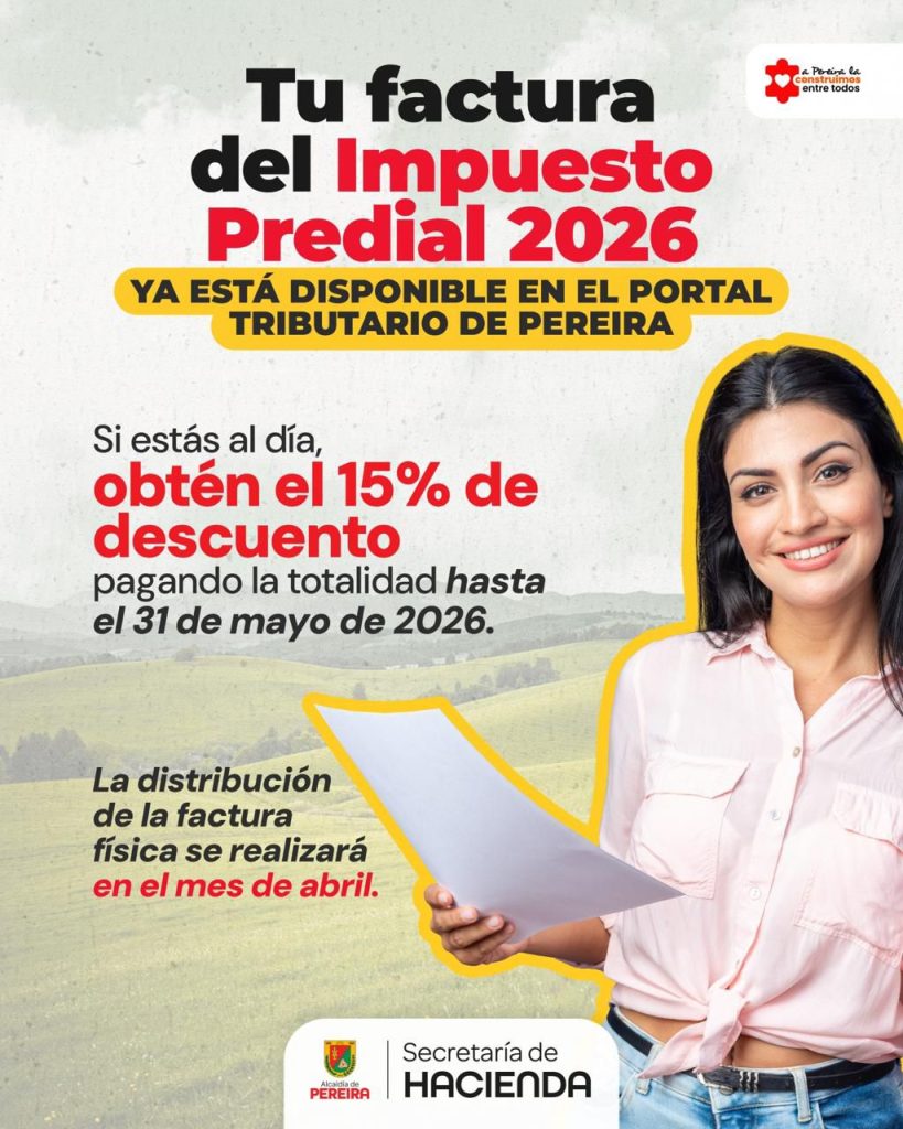 “Actualmente, el recibo del Impuesto Predial 2026 ya se encuentra disponible en el Portal Tributario de Pereira para su consulta, descarga y pago”, indicó el funcionario.