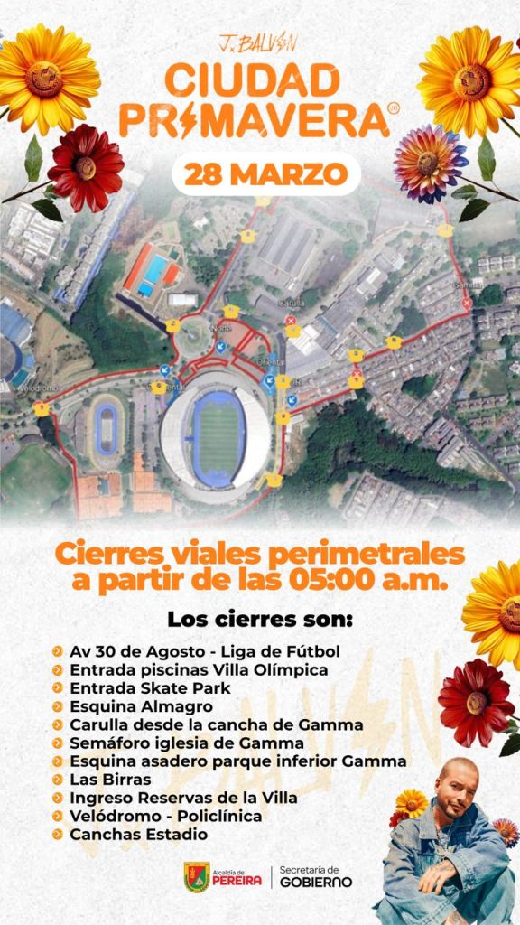 Los cierres viales en Pereira por el concierto de J Balvin marcarán la movilidad este 28 de marzo. Las autoridades anunciaron restricciones desde las 5:00 a.m. en el sector de la Villa Olímpica.