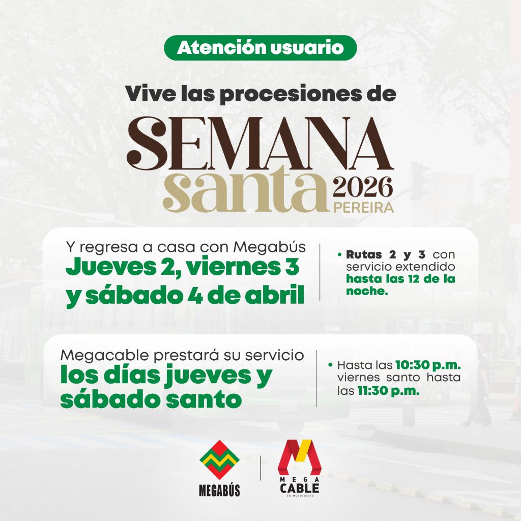La Semana Santa 2026 en Pereira contará con horarios especiales en el sistema de transporte masivo, con el objetivo de facilitar la movilidad de ciudadanos y visitantes durante las tradicionales procesiones.