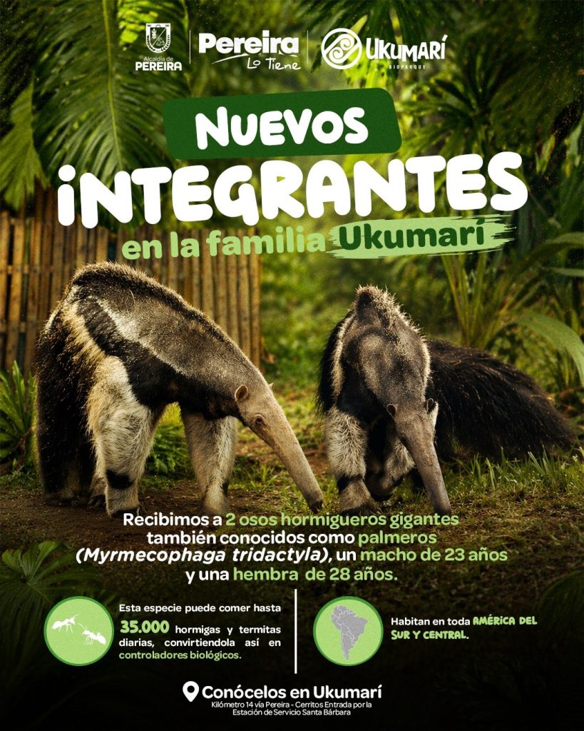 El Bioparque Ukumarí, reconocido como Santuario para la Flora, la Fauna y la Cultura, dio la bienvenida a dos ejemplares de oso hormiguero gigante. Se trata de una especie conocida científicamente como Myrmecophaga tridactyla. Asimismo, estos animales llegan desde la Fundación Zoológica de Cali, donde recibieron atención durante varios años.